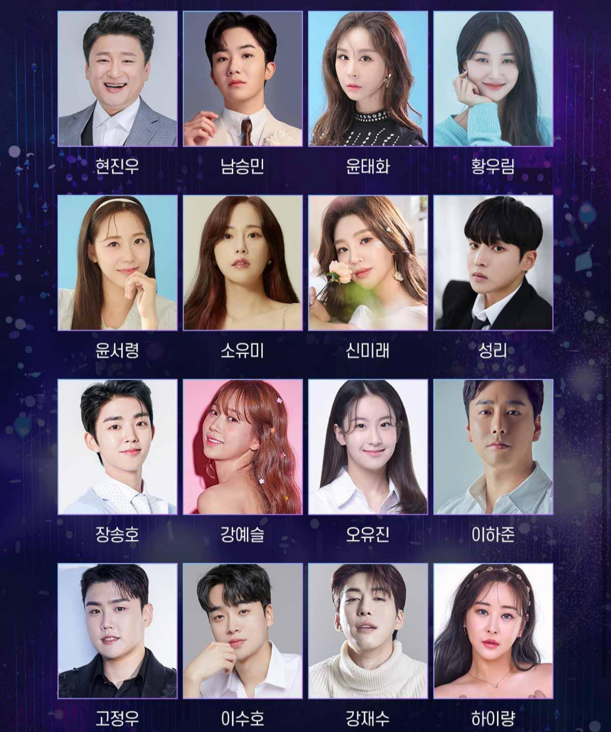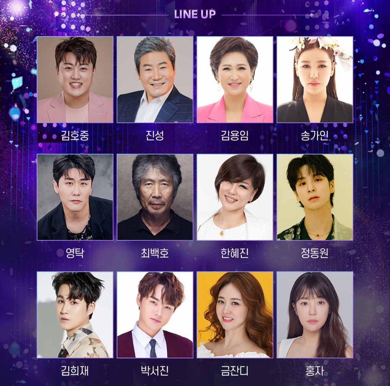✨ 김호중, 진성, 김용임, 송가인, 영탁, 최백호, 한혜진, 정동원, 김희재, 박서진, 금잔디, 홍자, 양지은, 박군, 나태주, 정다경, 조명섭, 은가은, 전유진, 양지원, 김민희, 정미애, 황민우, 황민호, 윙크, 서지오, 조정민, 별사랑, 강혜연, 풍금, 신인선, 영기, 현진우, 남승민, 윤태화, 황우림, 윤서령, 소유미, 신미래, 성리, 장송호, 강예슬, 오유진, 이하준, 고정우, 이수호, 강재수, 하이량, 허찬미, 이대원, 박세욱, 금윤아 출연.